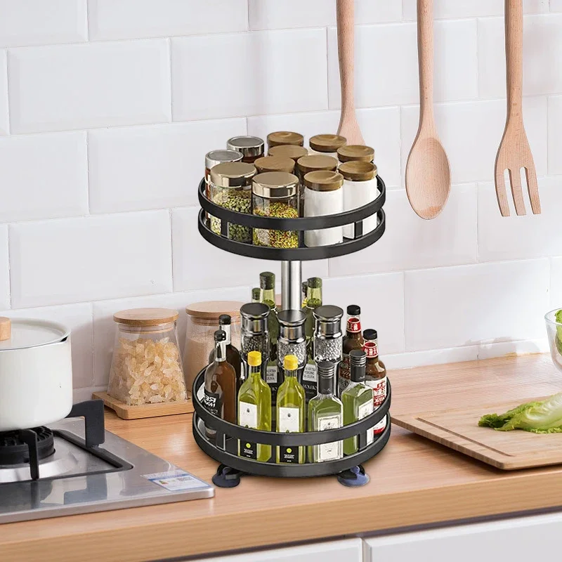 Both tiers of the rotating spice rack are organized with raised edges to prevent any items from slipping off. The two turntables of the lazy rotator rotate 360 degrees smoothly and silently
